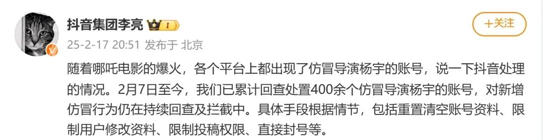 尽管2月7日至17日,仅抖音就已累计查处400余个仿冒《哪吒》电影导演饺子(杨宇)的账号,但只要搜索“饺子”“饺子导演”等关键词,“假饺子”仍然比比皆是。