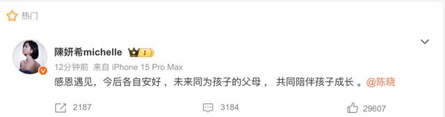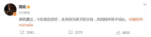 18日,@陈晓 @陈妍希michelle 共同发声:“感恩遇见,今后各自安好,未来同为孩子的父母,共同陪伴孩子成长。”