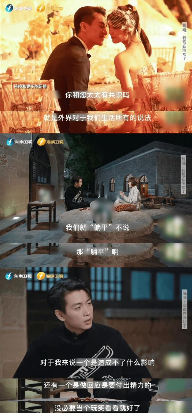 据悉,陈妍希和陈晓婚后喜欢静静地过家庭生活,但网络上却每隔一段时间就会出现两人失和传闻。对此,陈晓曾在一档访谈节目中回应称,会将工作和生活完全分开,完全不分享,外界对于他们夫妻二人的说法或传言,不知从何解释,于是和陈妍希达成共识选择“躺平”:“对我来说造成不了什么影响,还有做回应是要付出精力的,没必要,当个玩笑看看就好了,而且可能连玩笑都算不上。”