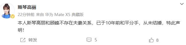 刚刚,斯琴高丽发文称自己和顾峰不存在夫妻关系,从未结婚,10年前已分手。