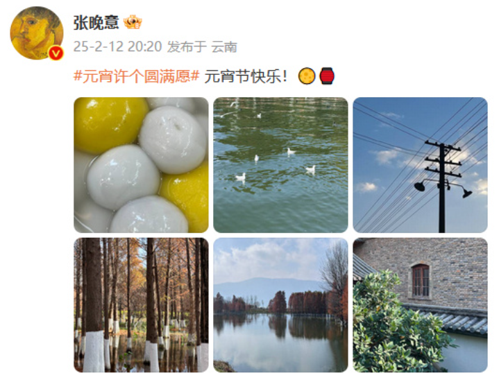 2月19日中午,@张晚意工作室 发文回应:“剧组同事一起分享元宵节汤圆。单身小张云南拍戏中,我们《似锦》见!”