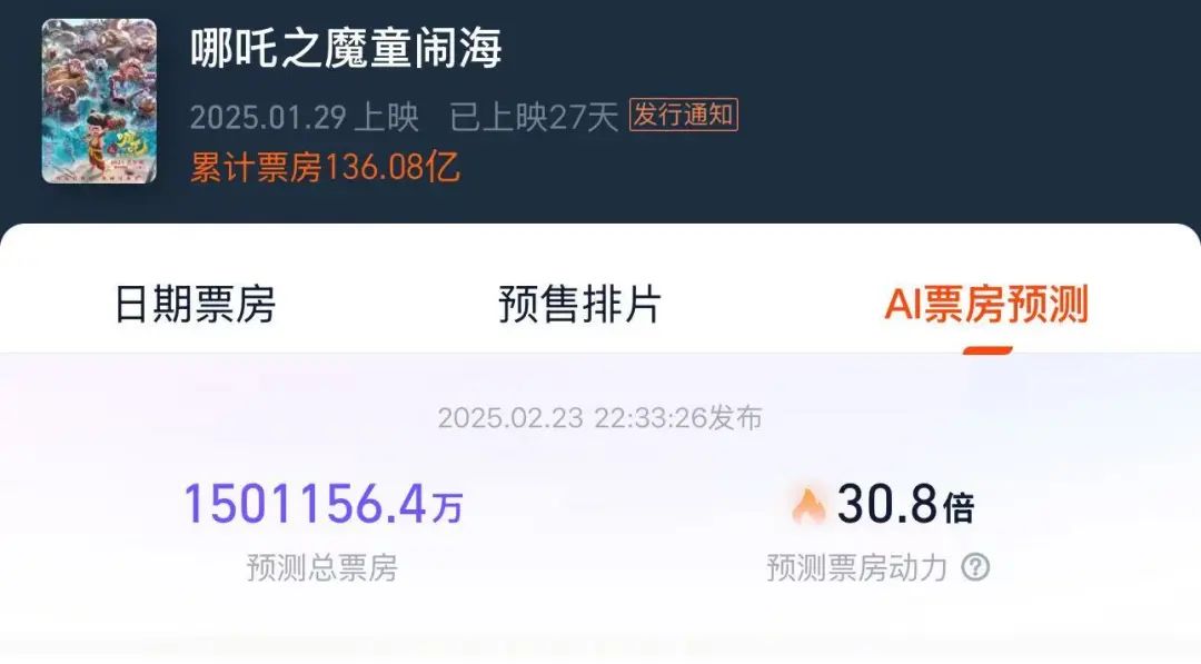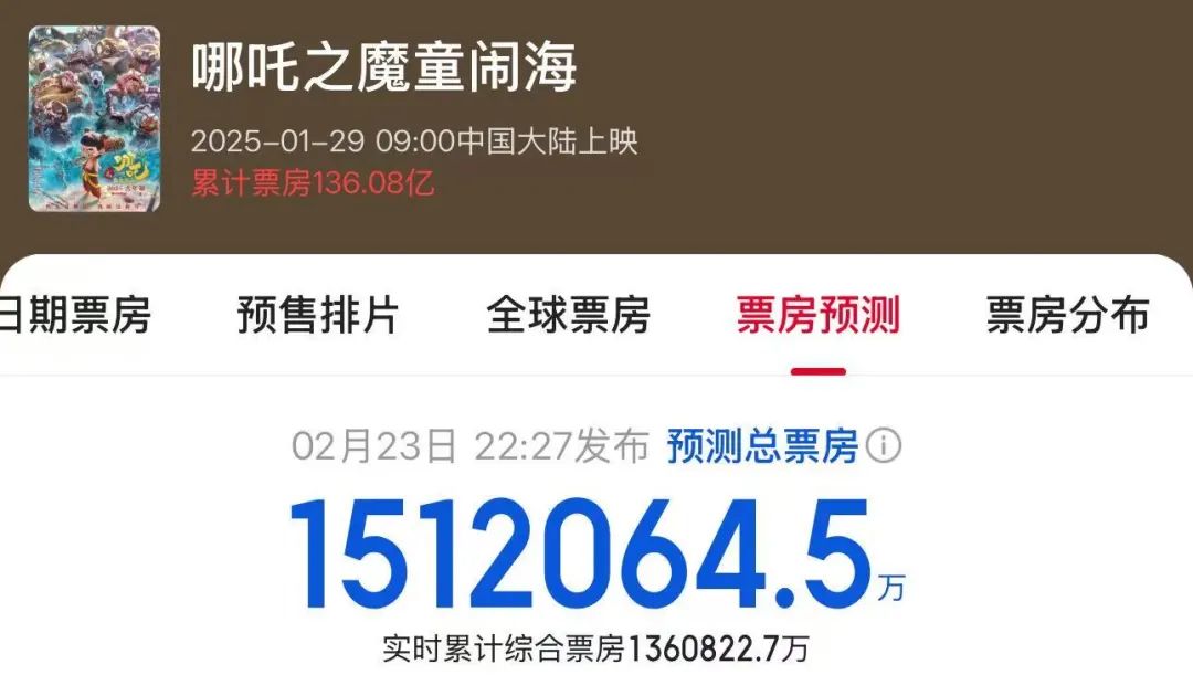 目前,猫眼专业版和灯塔专业版给出的票房预测均在150亿元左右。
