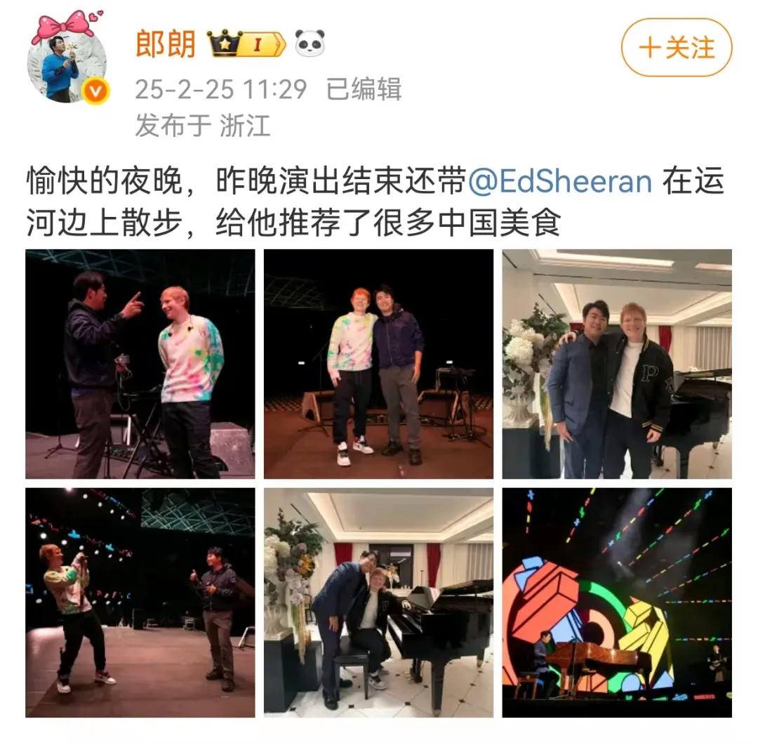 2月25日,钢琴家郎朗在个人社交平台发文:愉快的夜晚,昨晚演出结束还带Ed Sheeran在运河边上散步,给他推荐了很多中国美食。