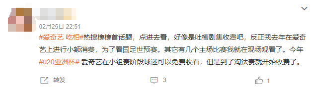 有网友表示,爱奇艺播国足世预赛也单独收费,播U20亚洲杯淘汰赛收费。此前国足18强赛,由于直播平台仅爱奇艺一家,球迷必须花9元开通连续包月的爱体育会员,用赠送的观赛券才能观看,没有会员则需按照原价18元购买单场,普通视频会员无法观赛。即便如此,还是出现大量网友购买了会员却无法观赛的情况,爱奇艺平台还因此发文致歉。