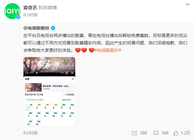 电视剧《爱你》官博发文称:在平台及电视台同步播出的剧集,需在电视台播出后解锁免费集数。目标是更多的观众都可以通过不同方式观看到剧集精彩内容。因此产生的观看问题,我们深感抱歉,我们会争取给大家更好的体验。