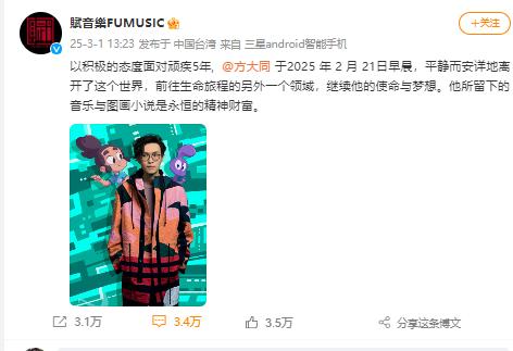据微博@賦音樂FUMUSIC消息,以积极的态度面对顽疾5年, 方大同于2025年2月21日早晨,平静而安详地离开了这个世界,前往生命旅程的另外一个领域,继续他的使命与梦想。他所留下的音乐与图画小说是永恒的精神财富。
