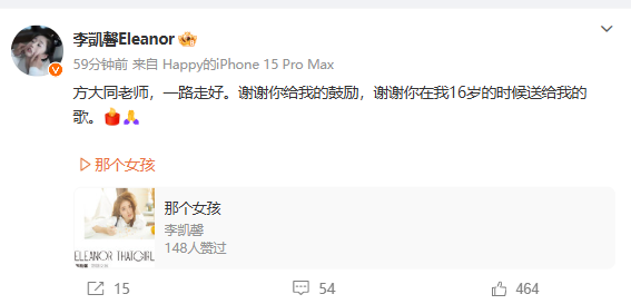 歌手李凯馨写道“方大同老师一路走好,谢谢你给我的鼓励,谢谢你在我16岁的时候送给我的歌”