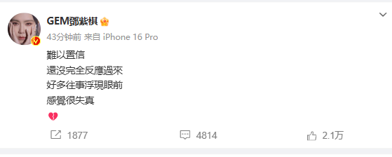 歌手邓紫棋也在社交平台上写道:“难以置信,还没完全反应过来,好多往事浮现在眼前,感觉很失真。”