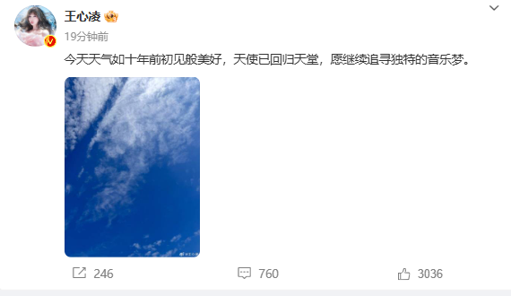 王心凌写道“今天天气如十年初见般美好,天使已回归天堂,愿继续追寻独特的音乐梦”。方大同曾为王心凌打造歌曲《天使的偏执》。歌手袁娅维更是连发23个“不是真的”!