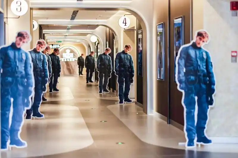 “拍照打卡区”更是人气爆棚,数块LED屏反复播放主角米奇被打印出来的画面,观众们仿佛一次次旁观了米奇的重生,这与一旁米奇工作状态的海报墙共同构成了一个关于存在与复制的双重叙事,各种心碎难顶的宇宙打工时刻展现在大家眼前。另一侧的立体海报框和人形立牌则更具趣味性,十七个米奇人形立牌更是引发了大家的“创意”合影巧思,纷纷化身米奇“多重身”的一员,尽情体验一日限定的“太空消耗体”活动。