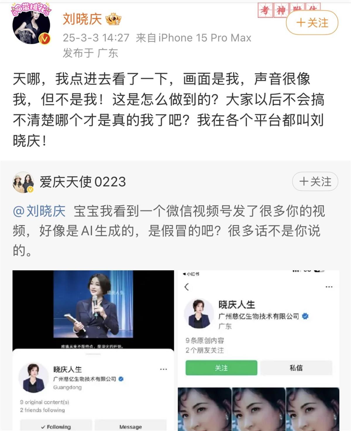 刘晓庆很快就给出了回复:“天哪,我点进去看了一下,画面是我,声音很像我,但不是我!这是怎么做到的?大家以后不会搞不清楚哪个才是真的我了吧?我在各个平台都叫刘晓庆!”