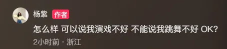 对于自己的魔性舞姿走红,杨紫本人也在社交媒体上回应称:“怎么样,可以说我演戏不好,不能说我跳舞不好,OK?”