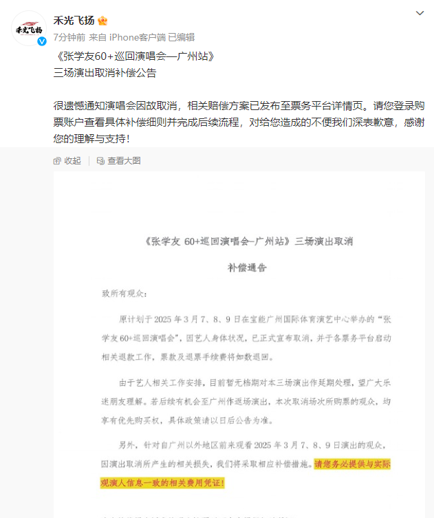 3月8日,《张学友60+巡回演唱会—广州站》发布三场演出取消补偿公告,详情如下:
