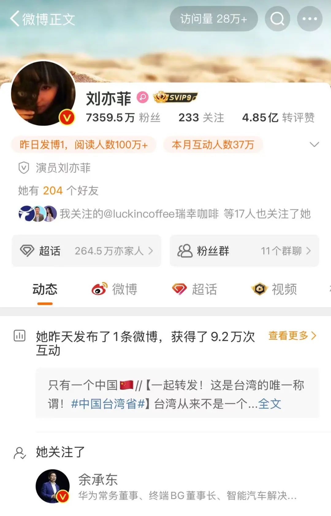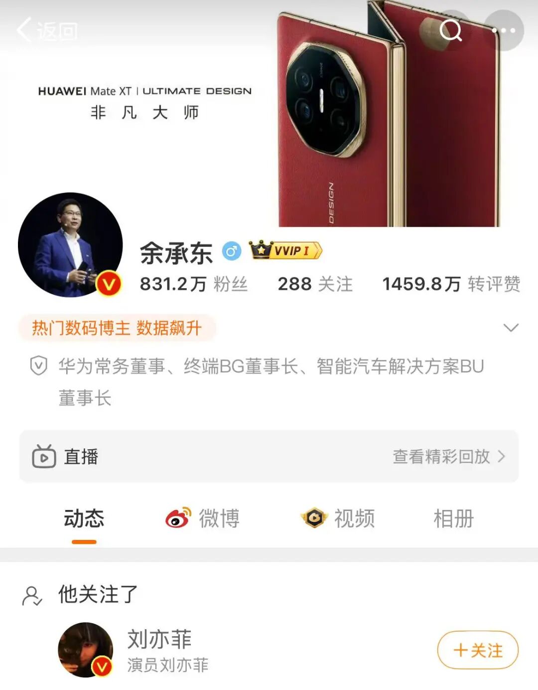 据悉,当天,有网友发现,演员刘亦菲和华为常务董事、终端BG董事长、智能汽车解决方案BU董事长余承东互相关注了对方微博。