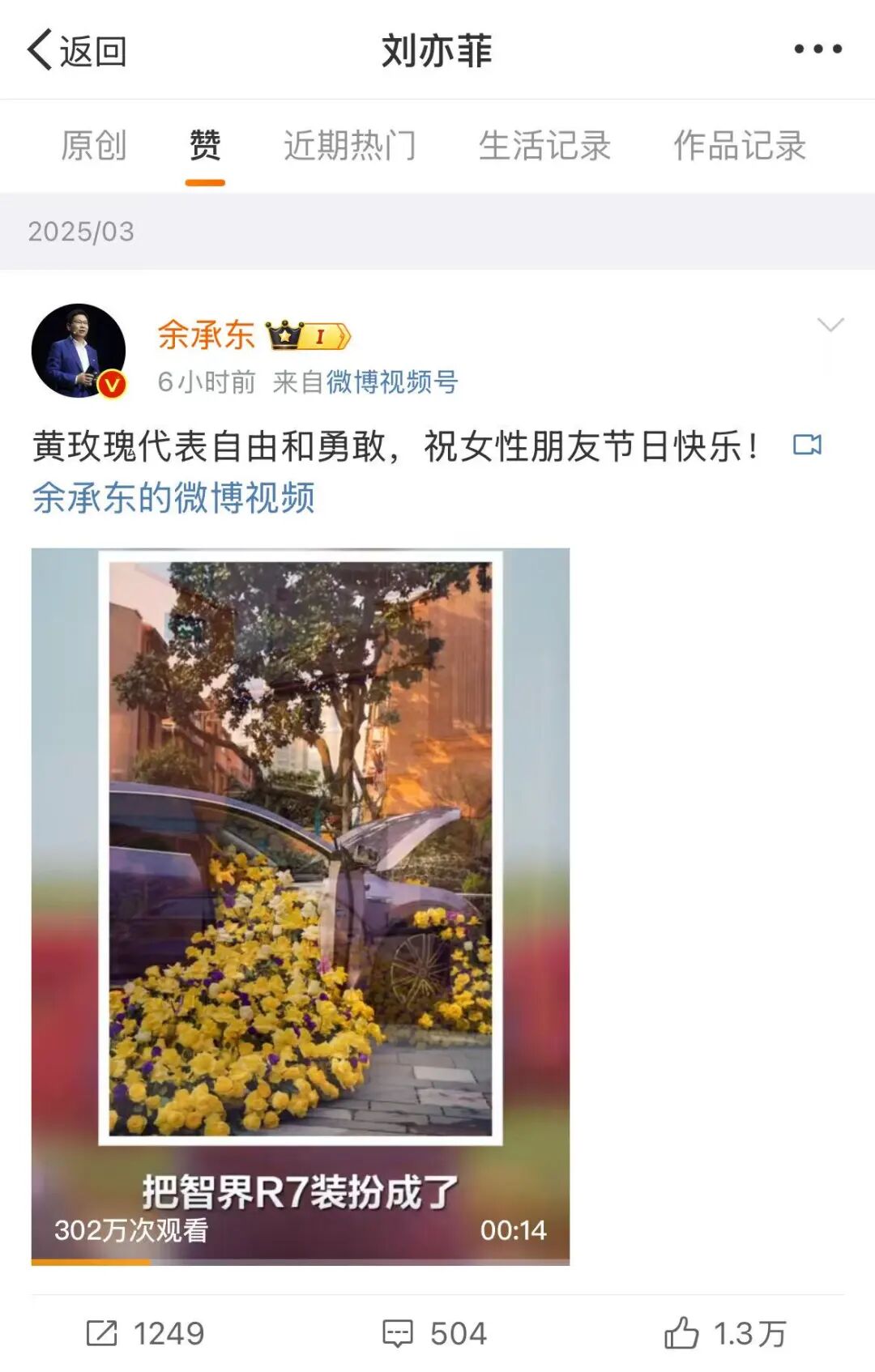 此外,当天余承东还发布了一条视频,并配文:“黄玫瑰代表自由和勇敢,祝女性朋友节日快乐!”该视频显示了一辆装扮了大量黄玫瑰的智界R7。随后,刘亦菲也点赞了该条微博。