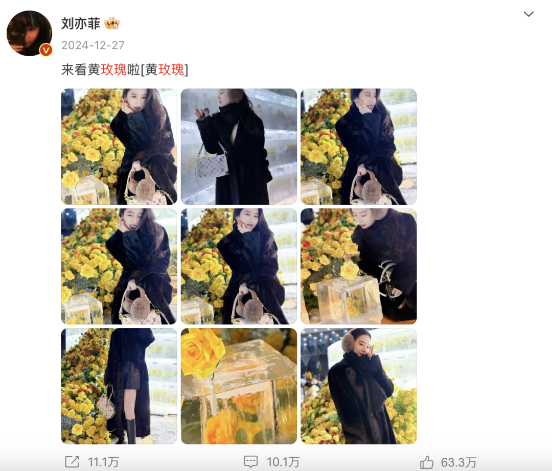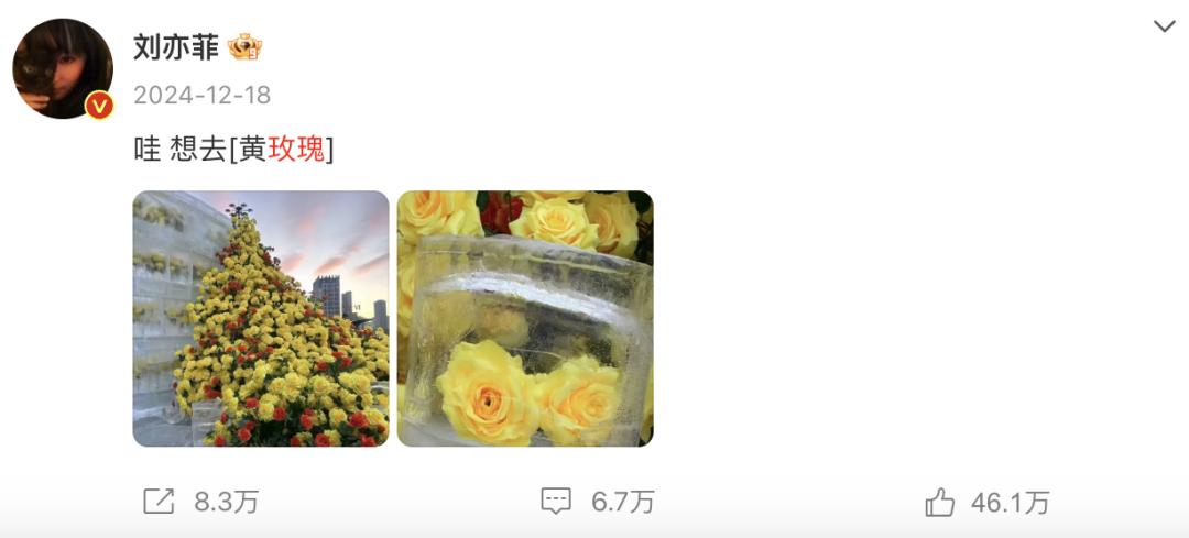 去年,由刘亦菲、佟大为领衔主演的电视剧《玫瑰的故事》火爆全网,刘亦菲在剧中饰演女主角黄亦玫,这也让众多网友将其和黄玫瑰划上关联号。去年年底,哈尔滨举办的冬日限定活动,以独特的透明冰雕黄玫瑰吸引了众多游客的目光,更和刘亦菲联动。