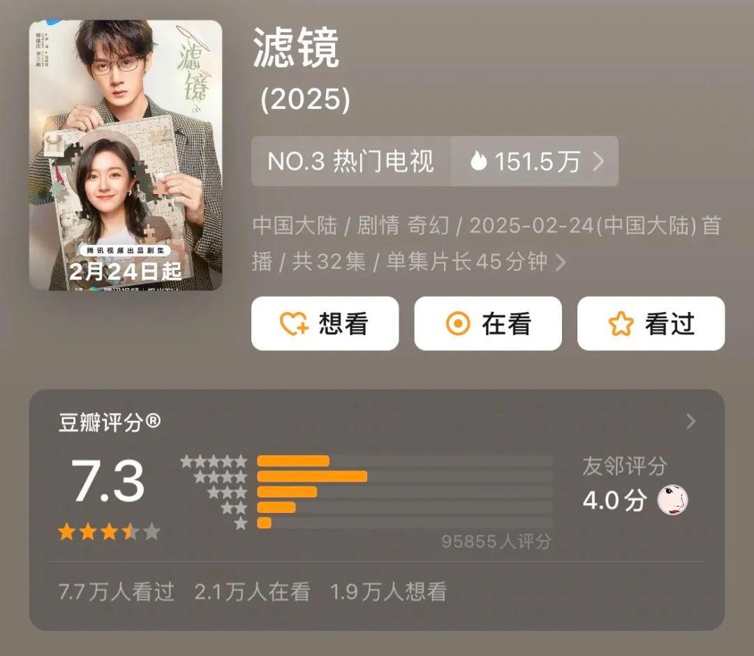 檀健次、李兰迪主演的《滤镜》,豆瓣评分7.3。