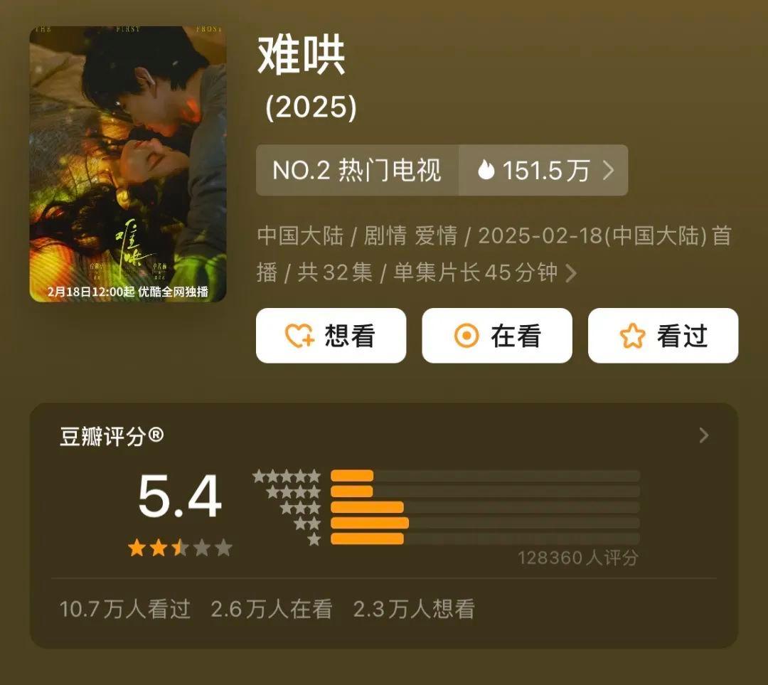 白敬亭、章若楠主演的《难哄》,豆瓣评分5.4分。