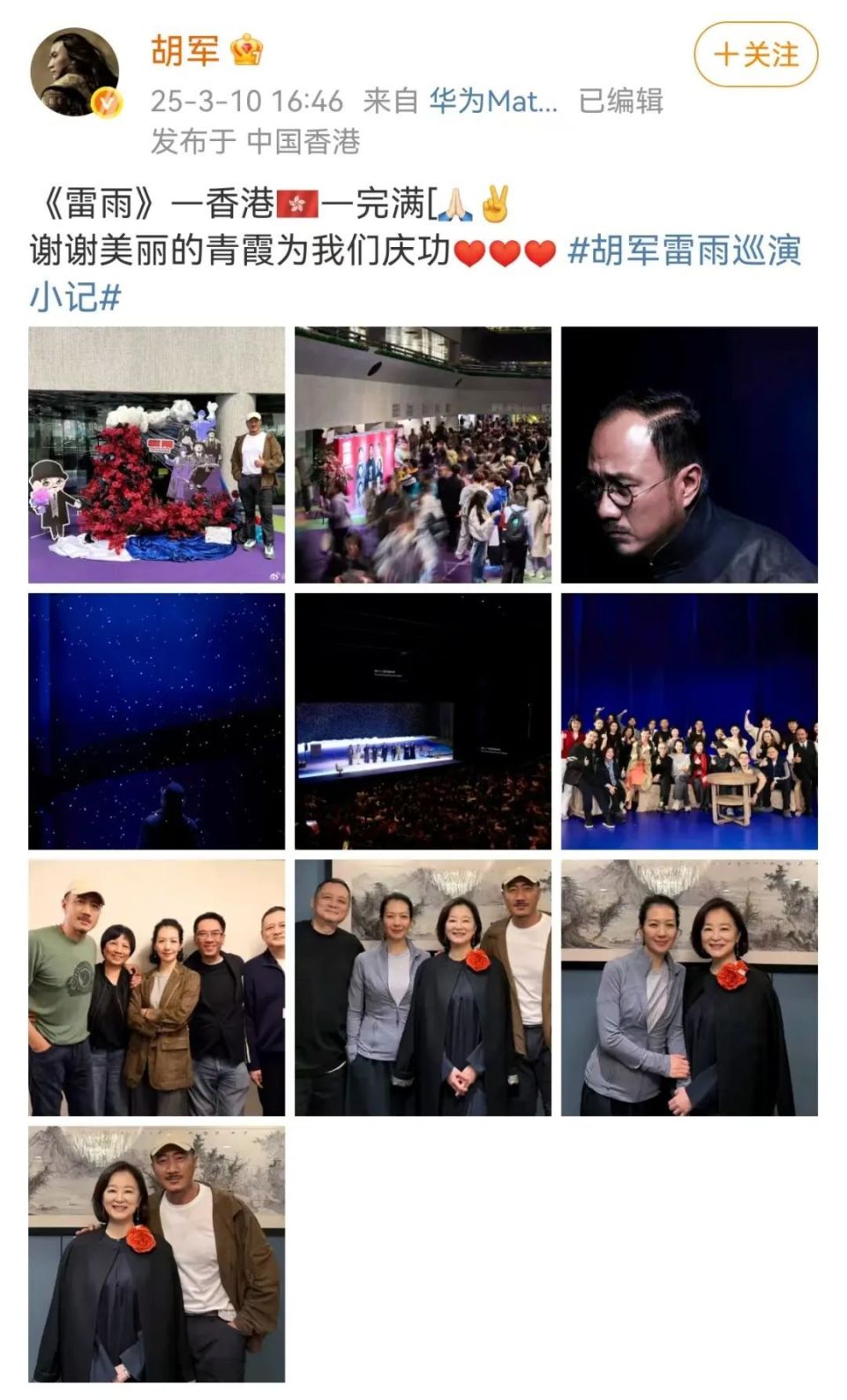 3月10日,演员胡军在个人社交平台晒出多张照片,并配文:《雷雨》—香港🇭🇰—完满。谢谢美丽的青霞为我们庆功。