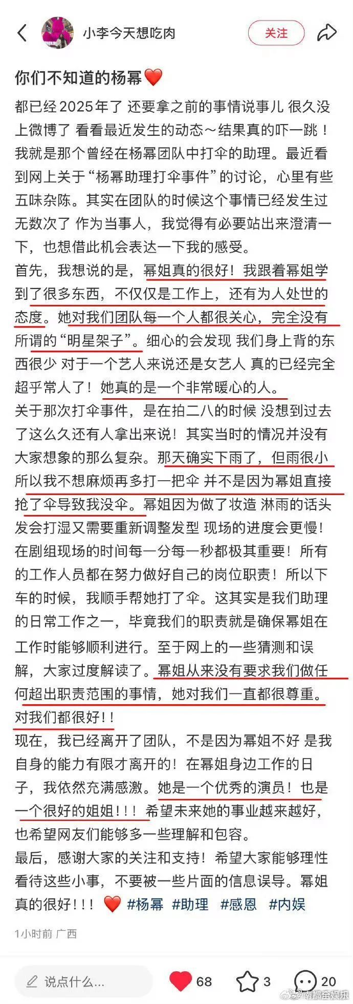 近日,杨幂前助理发布长文回忆与杨幂一同工作的日常,里面提及网传“杨幂抢助理雨伞,导致助理淋雨”的视频,她表示是自己觉得麻烦不想打伞,“因为雨很小。但是杨幂带着拍戏妆造,淋到雨需要重做造型很麻烦”。她还表示杨幂对团队每一个人都很关心,完全没有所谓的“明星架子”,“从来没有要求我们做任何超出职责范围的事情,她对我们一直都很尊重,对我们每个人都很好。她是优秀的演员,也是很好的姐姐。”