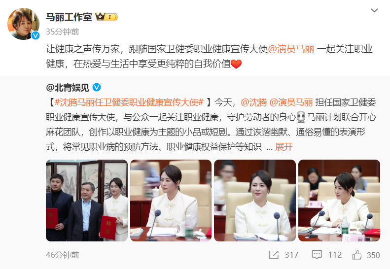 12日,@马丽工作室 对此回应称,让健康之声传万家,跟随国家卫健委职业健康宣传大使马丽一起关注职业健康,在热爱与生活中享受更纯粹的自我价值。