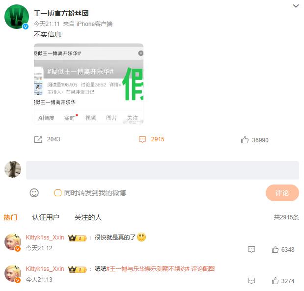 对此,王一博官方粉丝团账号发文回应:此为不实信息。