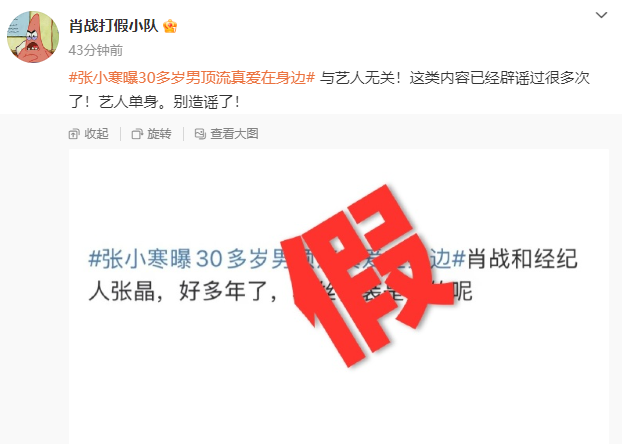 3月21日,针对话题词#张小寒曝30多岁男顶流真爱在身边#,肖战方辟谣。