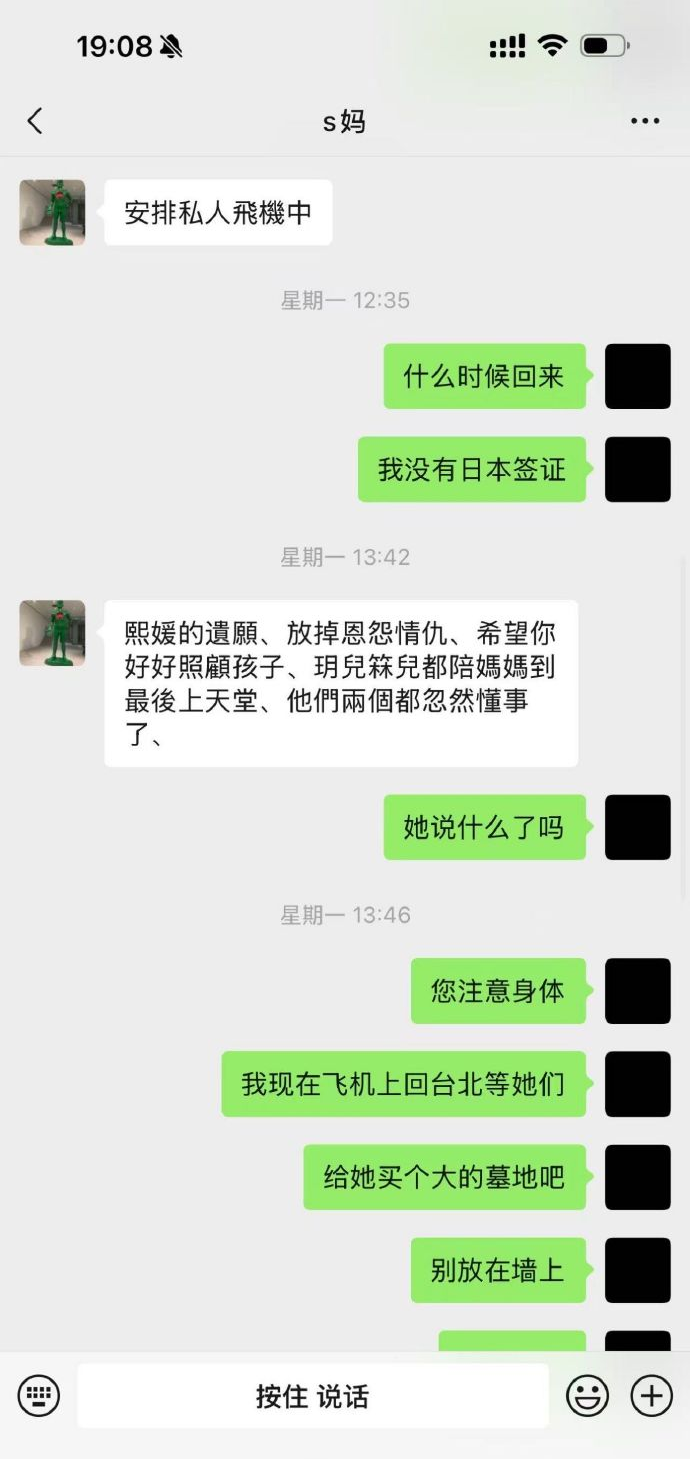 3月21日,汪小菲被曝在大S确定火化的前一晚,致电骂S妈(黄春梅)(此前报道:S妈证实:大S火化前夕,汪小菲打电话对她疯狂大骂)。而记者葛斯齐则表示“他当时情绪崩溃,觉得家人没有好好照顾大S。”并秀出汪小菲与S妈对话。对话截图中,汪小菲表示自己没有日本签证,所以先飞台湾等候,S妈则告诉他:“熙媛的遗愿,放掉恩怨情仇,希望你好好照顾孩子,两孩子都陪妈妈到最后,他们两个都忽然懂事了。”