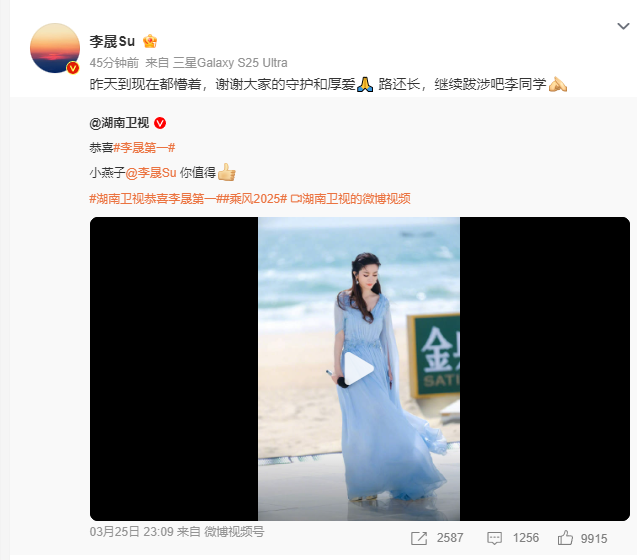 26日上午11时许,李晟在微博上发文称:昨天到现在都懵着,谢谢大家的守护和厚爱。 路还长,继续跋涉吧李同学。