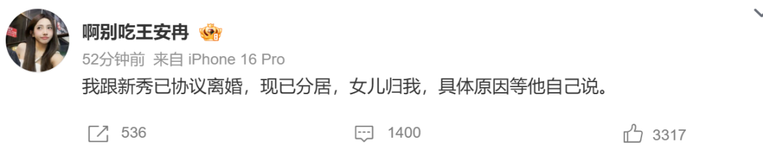 3月30日,王安冉发文称已经和Rapper新秀协议离婚:“我跟新秀已协议离婚,现已分居,女儿归我,具体原因等他自己说。”随后,话题#新秀王安冉离婚#冲上热搜。