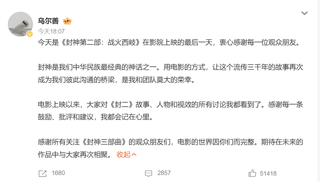 今天是《封神第二部:战火西岐》在影院上映的最后一天,衷心感谢每一位观众朋友。