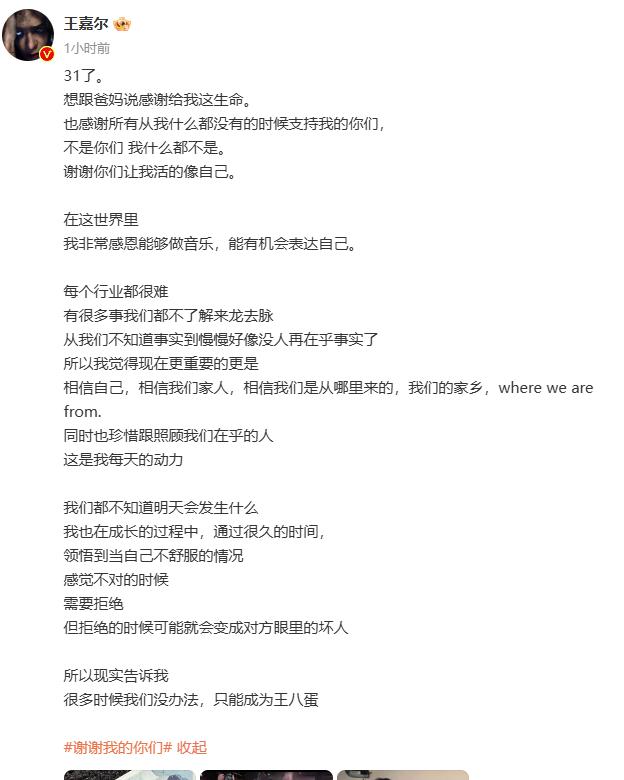 3月28日是王嘉尔31岁生日,4月1日,王嘉尔发长文感谢父母和粉丝:“31了,想跟爸妈说感谢给我这生命,也感谢所有从我什么都没有的时候支持我的你们,不是你们,我什么都不是,谢谢你们让我活得像自己。”评论区的粉丝也纷纷暖心回应:“你是我们的energy,我们的骄傲,我们的你继续开心做自己”,“我们也很感恩很珍惜拥有这么好的你”……