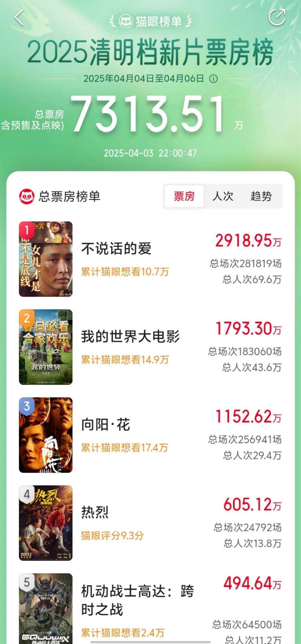 据猫眼专业版数据,截至4月3日22时,清明档新片《不说话的爱》单日票房达到2918万,超过已上映65天的动画电影《哪吒之魔童闹海》,成为内地电影市场新的单日票房冠军,这也意味着《哪吒之魔童闹海》保持的连续单日票房冠军纪录最终定格在了64天。