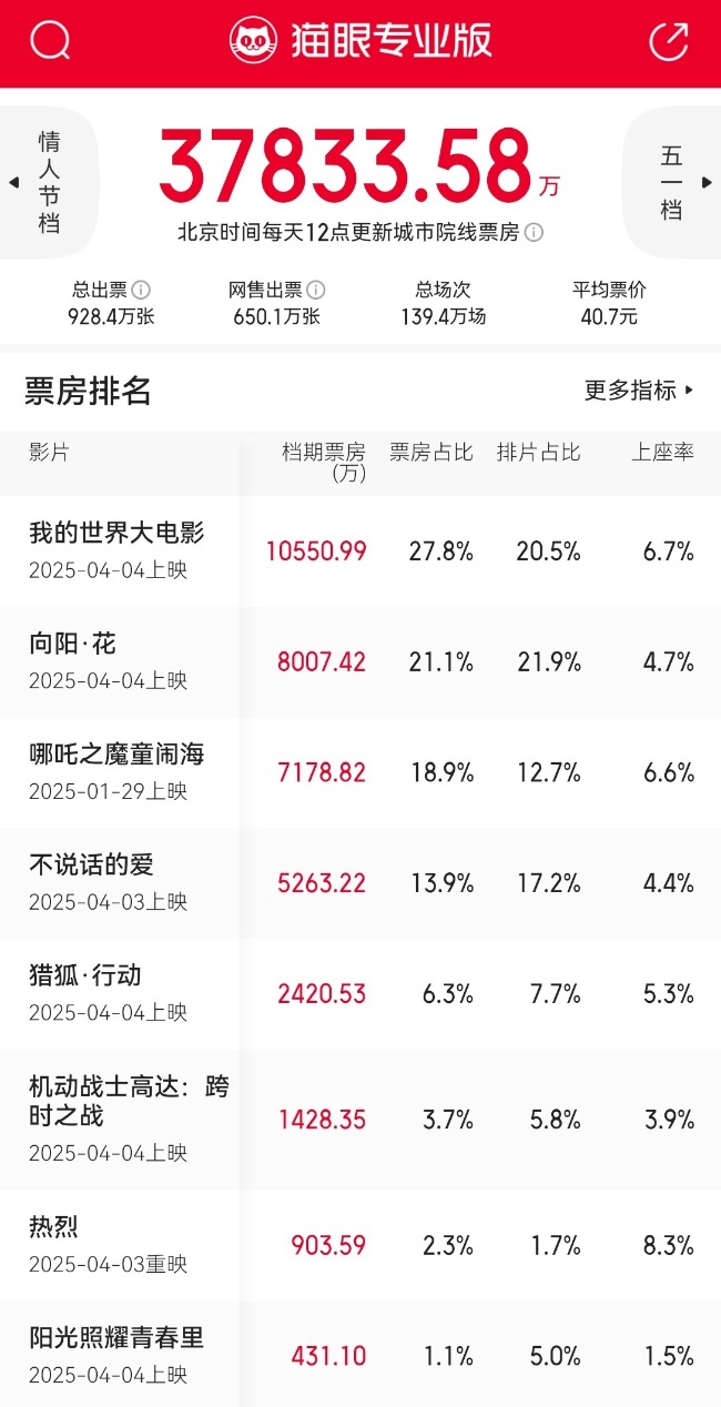 据猫眼专业版数据,截至4月6日,2025年清明档(4月4日—4月6日)档期总票房超3.78亿元。虽然冯小刚领衔国产电影抱团主打现实题材,但档期票房冠军由全球知名游戏IP改编的奇幻片《我的世界大电影》获得,而本片也成为档期内唯一票房破亿的电影。冯小刚执导、赵丽颖主演的剧情犯罪片《向阳·花》票房位列第二。