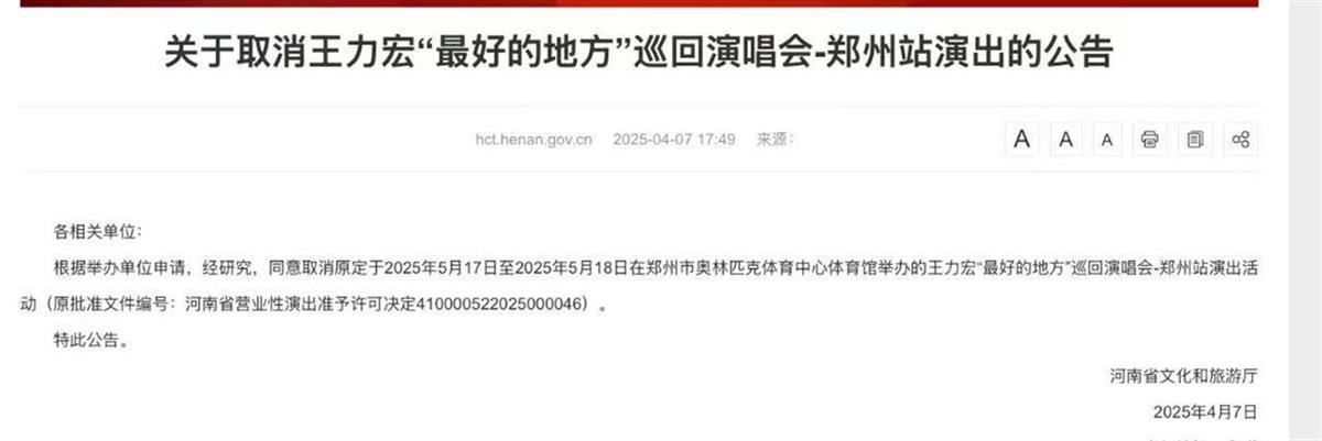 公告显示,根据举办单位申请,经研究,“同意取消原定于2025年5月17日至2025年5月18日在郑州市奥林匹克体育中心体育馆举办的王力宏‘最好的地方’巡回演唱会-郑州站演出活动。”