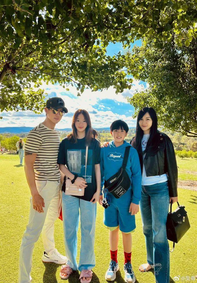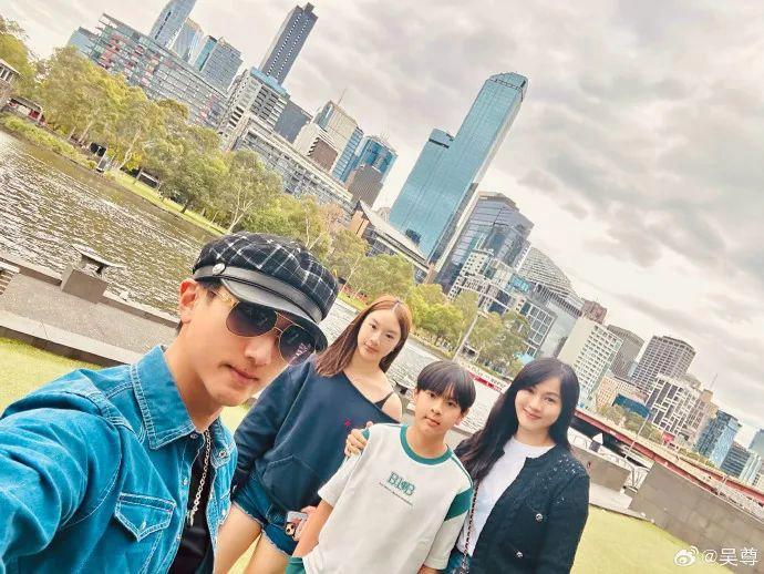4月13日,男星吴尊晒出一家四口的旅行大合照,妻子林丽吟、大女儿Neinei和小儿子Max纷纷出镜。照片中吴尊和妻子恩爱有加,女儿开始摆脱稚气风格时尚大长腿格外吸睛,儿子也迅速成长,身高快和姐姐一样高了。