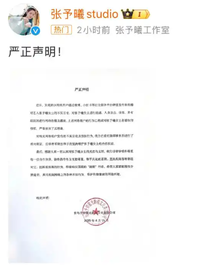 张予曦工作室于2025年4月15日发布严正声明,称部分网络用户通过社交媒体对张予曦进行造谣、人身攻击及有组织的网络霸凌,已委托律师取证并将采取法律手段维权。