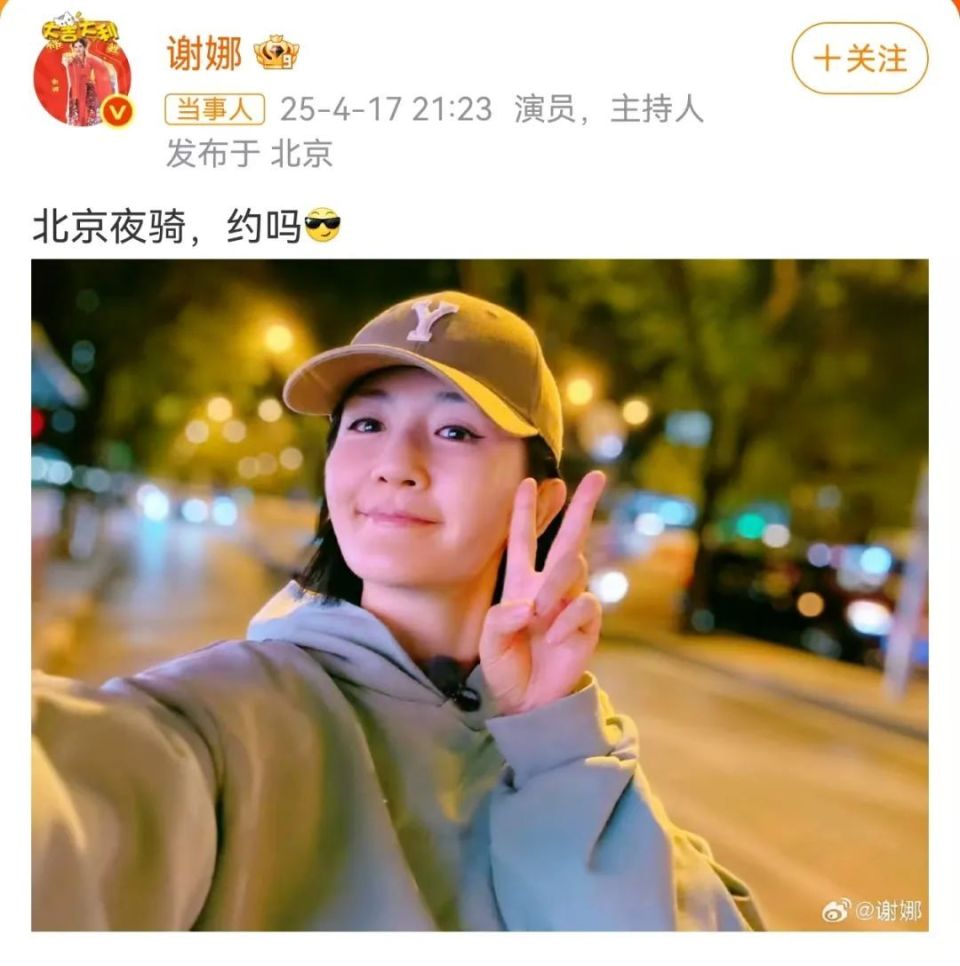 4月17日晚,谢娜在社交平台晒出了夜骑照。