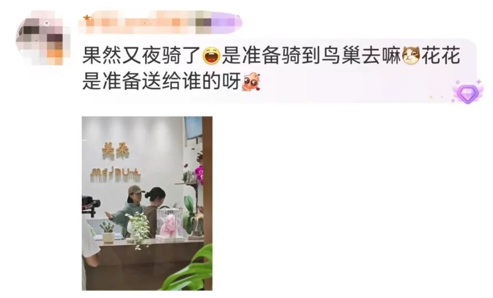 有网友发出视频称,谢娜在北京夜骑,带着一束玫瑰花,就这么骑到鸟巢送给张杰。