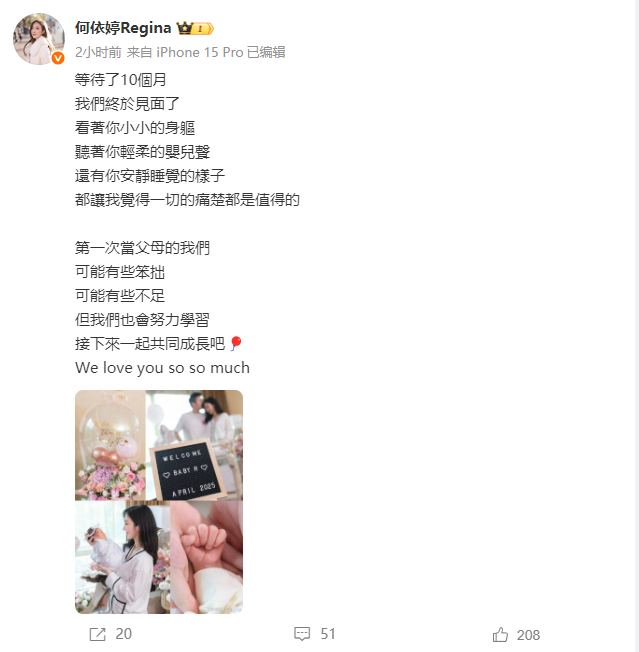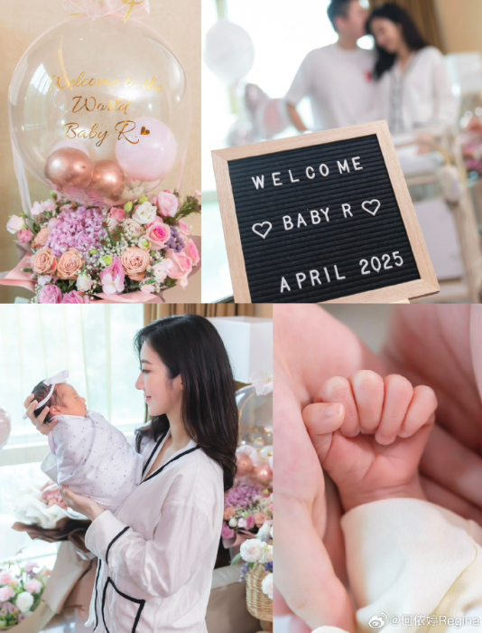 4月18日,《新闻女王》徐晓薇扮演者何依婷晒出抱着女儿、女儿小手的照片,官宣生女,“接下来一起共同成长吧🎈”