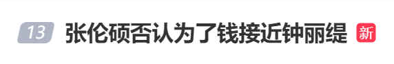 近日,有网友质疑张伦硕接近钟丽缇是为了钱,张伦硕回应:“我想问你,所有的男生如果找女生工资没他高的,是不是这些女生都是傍大款?你敢说这句话吗?难道我做错了什么?我的太太事业比我成功,工作能力比我强,这难道就是我的错吗?”