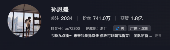 截至4月18日,孙恩盛在抖音拥有741万粉丝。