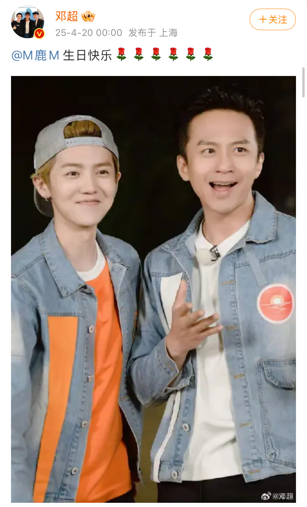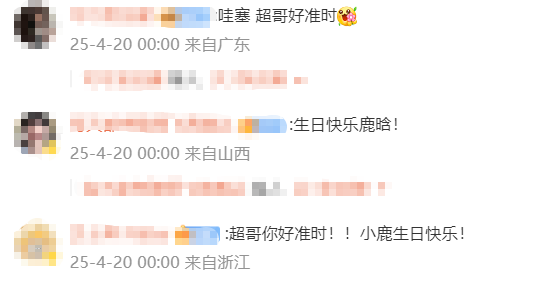 4月20日,鹿晗35岁生日,好友邓超、陈赫在零点准时为鹿晗送上生日祝福,祝其生日快乐。