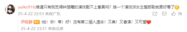 值得一提的是,有网友在底下评论,认为钟楚曦的演技配不上秦昊,应该换一个女主,伊能静对此回应:她非常好,没有第二个人适合。