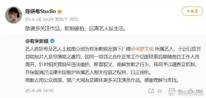 近日,八卦媒体拍到陈妍希与眉眼酷似陈晓的帅哥聚餐,26日下午陈妍希方发澄清声明:一同聚餐的男子王炫南为同厂牌艺人,两人受节目组制片人及导演组邀约,工作见面结束后跟随各自工作人员离开,并抵制违法偷拍、断章取义、曲解发散之行为。