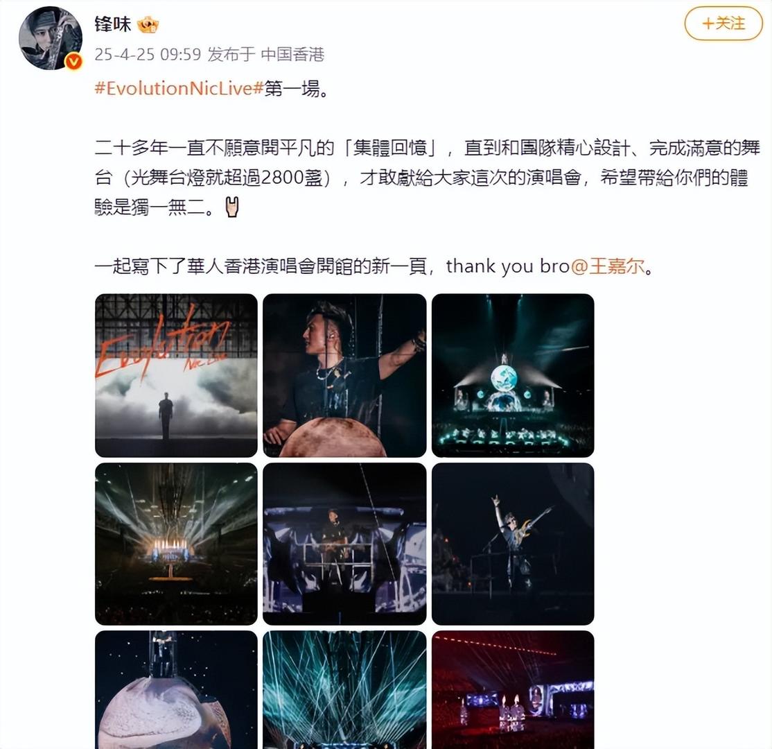 4月25日,谢霆锋在社交平台发文称:“二十多年一直不愿意开平凡的‘集体回忆’,直到和团队精心设计、完成满意的舞台(光舞台灯就超过2800盏),才敢献给大家这次的演唱会,希望带给你们的体验是独一无二。”