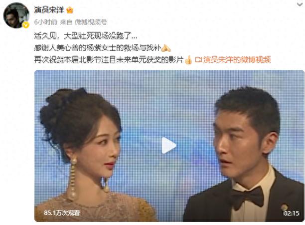 4月28日,演员宋洋发文:活久见,大型社死现场没跑了…感谢人美心善的杨紫女士的救场与找补。再次祝贺本届北影节注目未来单元获奖的影片。