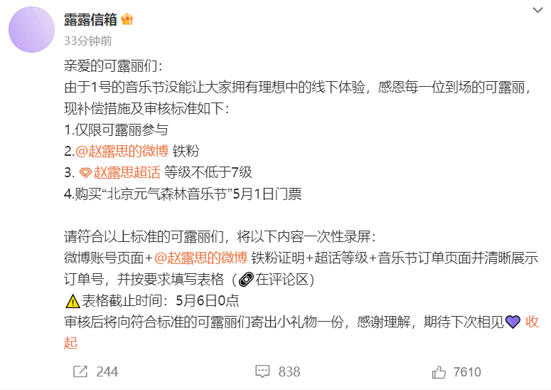由于1号的音乐节没能让大家拥有理想中的线下体验,感恩每一位到场的可露丽,现补偿措施及审核标准如下:1.仅限可露丽参与 2.@赵露思的微博 铁粉 3. 赵露思超话 等级不低于7级 4.购买“北京元气森林音乐节”5月1日门票。