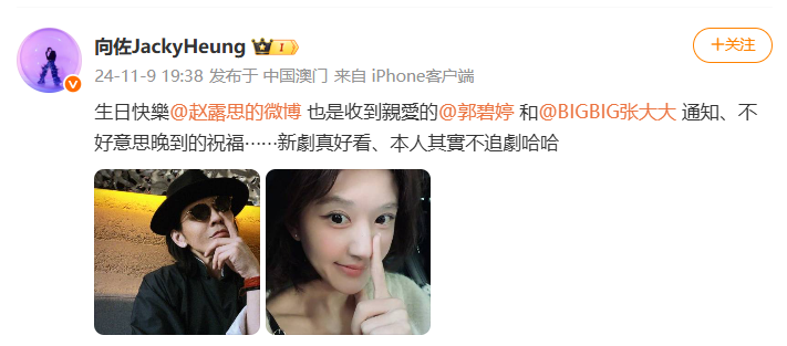 此前,赵露思和向佐就曾有过互动。2024年11月9日,向佐曾晒玩梗照为赵露思庆生:收到亲爱的郭碧婷和张大大通知,不好意思晚到的祝福。