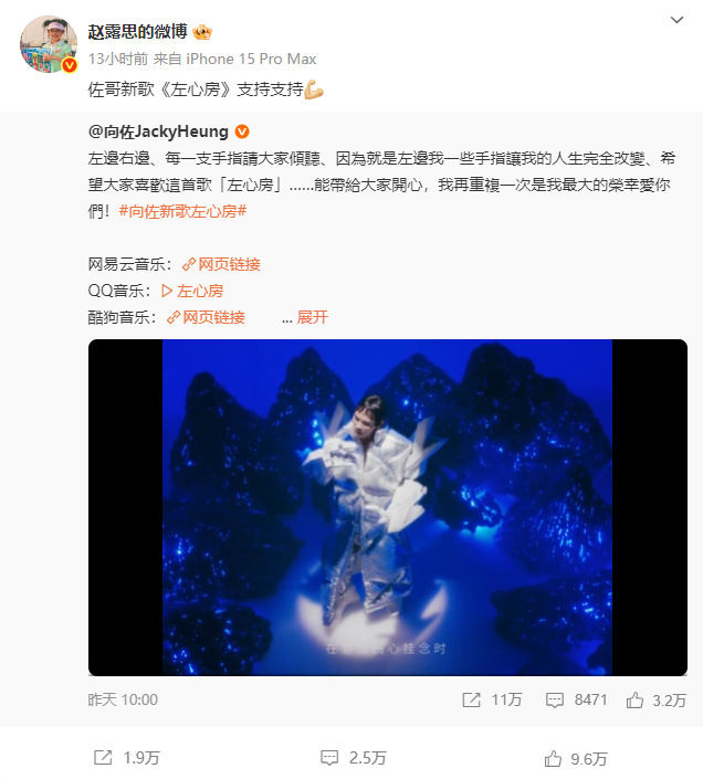 5月5日晚,赵露思在微博发文支持向佐新歌《左心房》。